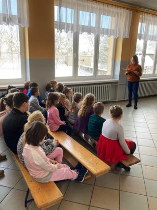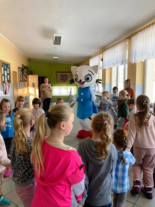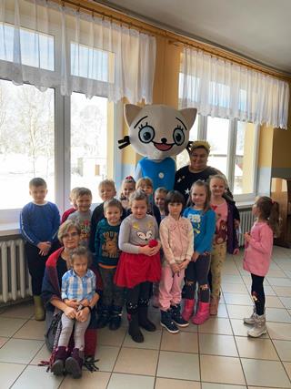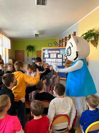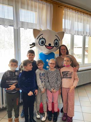 01.12.2021 roku naszą szkołę odwiedziła bohaterka książek dla dzieci - Kicia Kocia. Wielu uczniów nie spodziewało się spotkać maskotki o ludzkich rozmiarach, jednak pogodna twarz i bardzo łagodne, radosne usposobienie Kici Koci przekonały nasze dzieci do gościa.