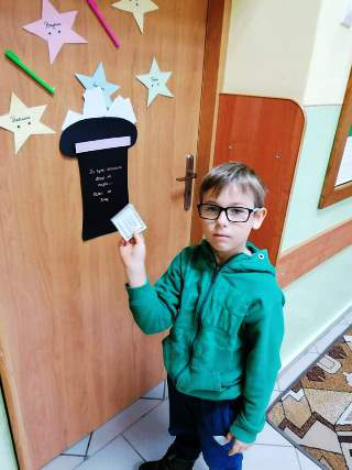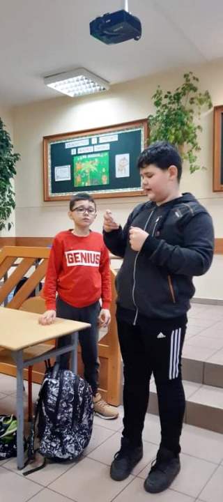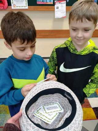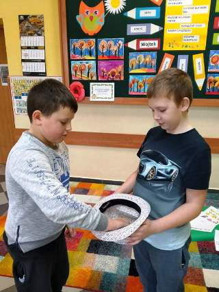 Następnie uczniowie losowali z kapelusza karteczki i odgrywali scenki, w których pokazywali jakie są różne formy powitań i pożegnań. Zabawa ta sprawiła dzieciom wiele radości.