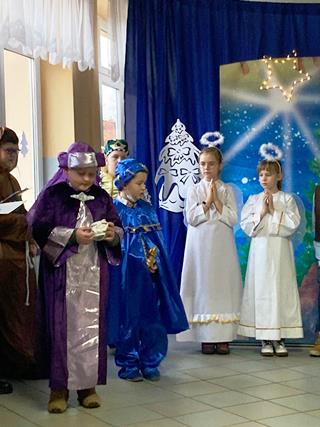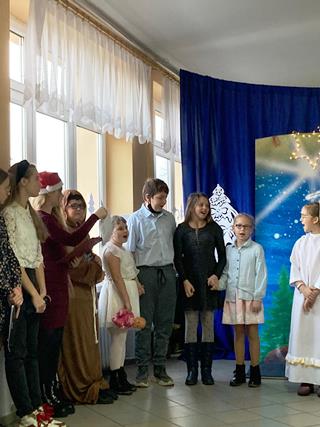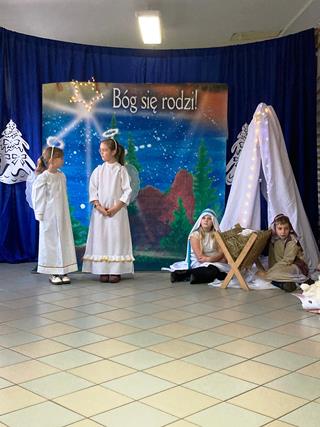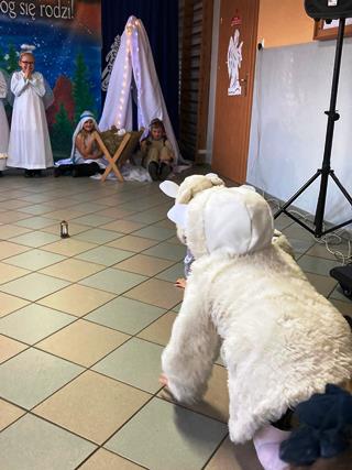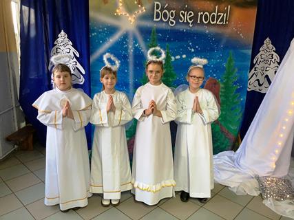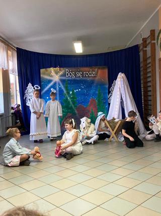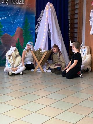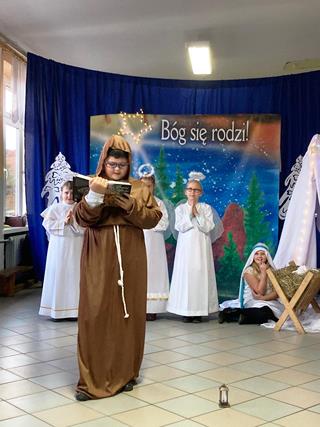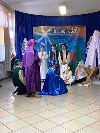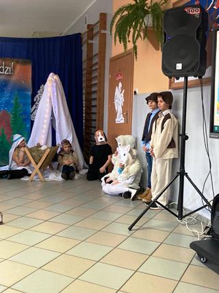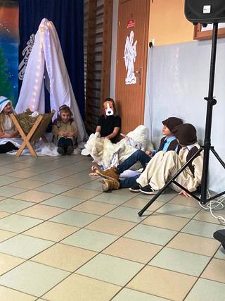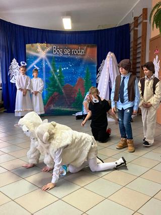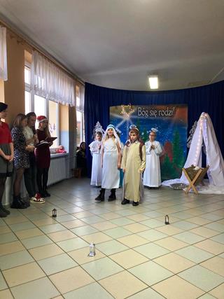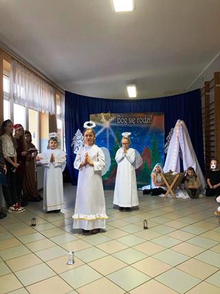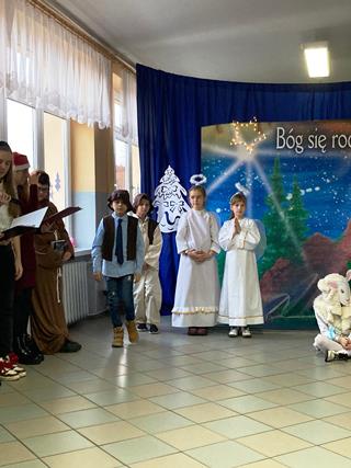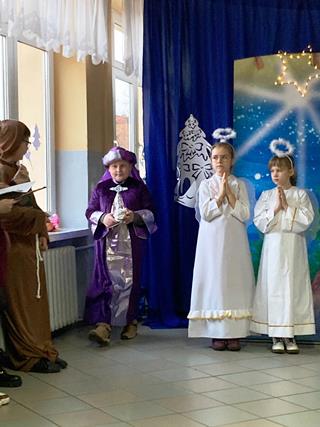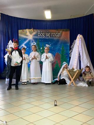 Uroczystość rozpoczęła się od barwnych jasełek upamiętniających Narodzenie Pańskie. W tym roku w postawoe pasterzy, aniołów, chóru niebiańskiego, diabła, Józefa wcielili się uczniowie nie tylko z klas I-III, ale również z klasy V i VII.