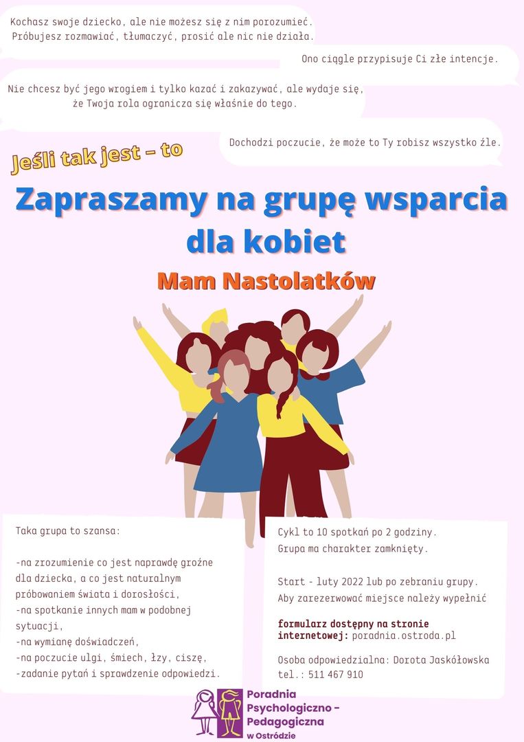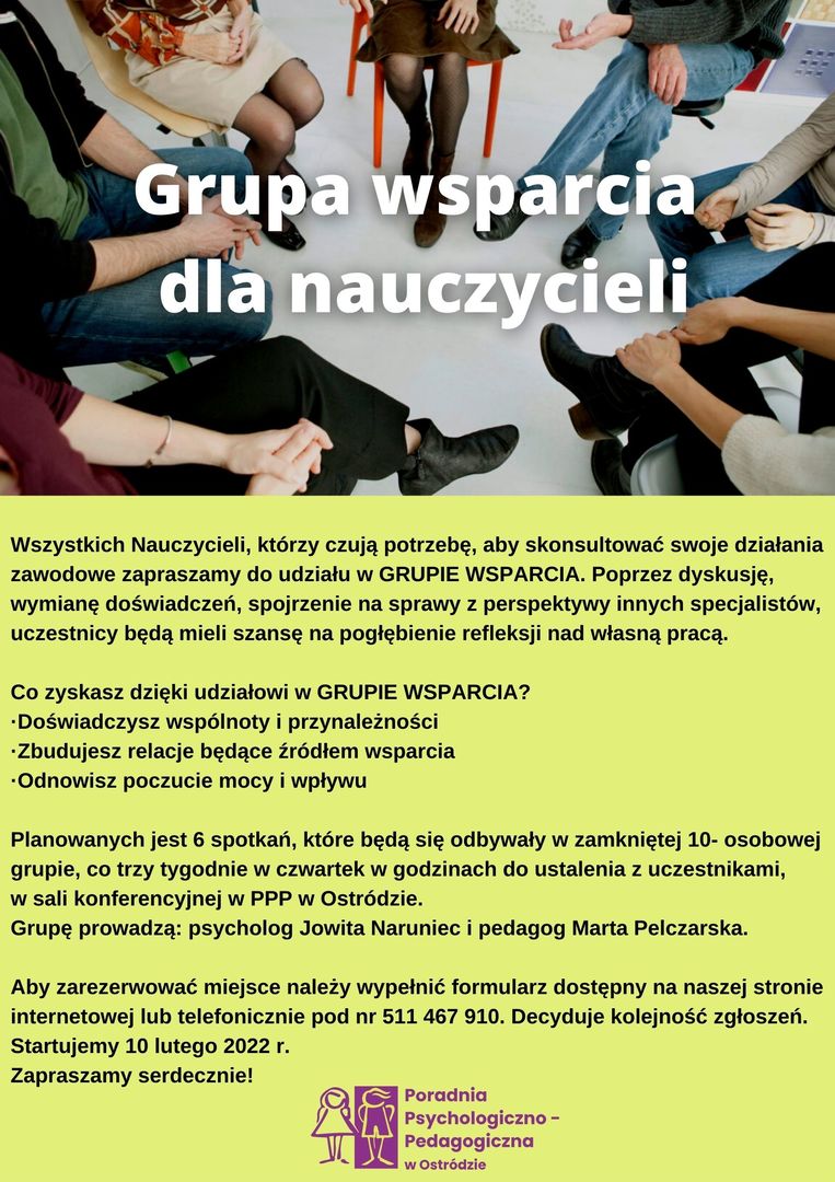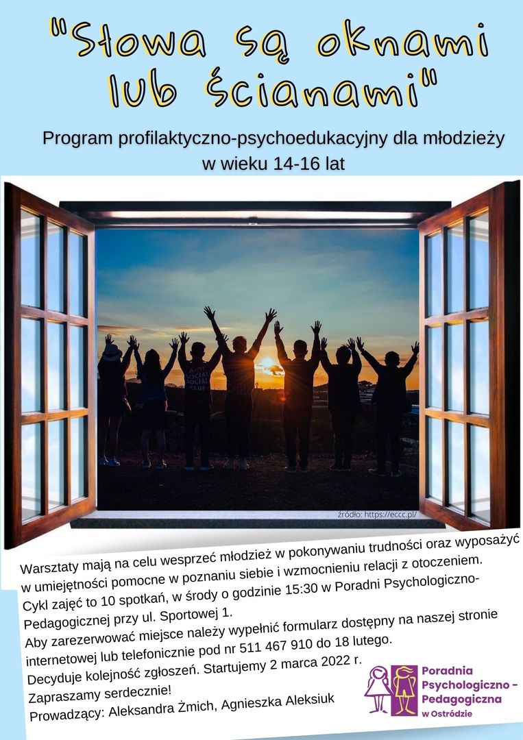 Przesyłam ofertę najbliższych działań Poradni Psychologiczno-Pedagogicznej i Powiatowej Biblioteki Pedagogicznej w Ostródzie. W załączeniu znajdują się plakaty dotyczące poszczególnych wydarzeń. Zapisy odbywają się poprzez formularz dostępny na naszej stronie internetowej lub telefonicznie pod nr tel. 511 467 910.