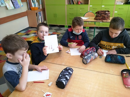 14 lutego, na pierwszej godzinie lekcyjnej, Franek uczestniczył w kreatywnych zajęciach klasy II. Uczniowie pracowali w grupach, a ich zadaniem było napisanie książeczki o przygodach psa Franka. Nie zabrakło barwnych ilustracji.