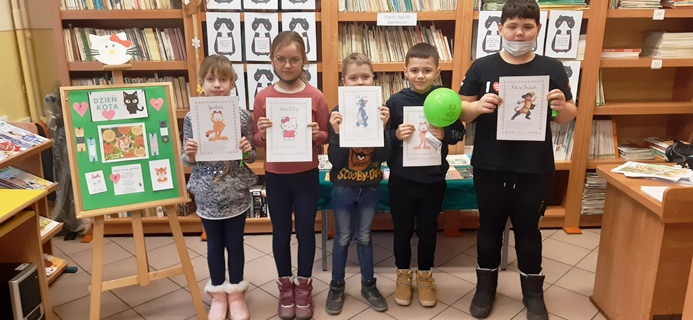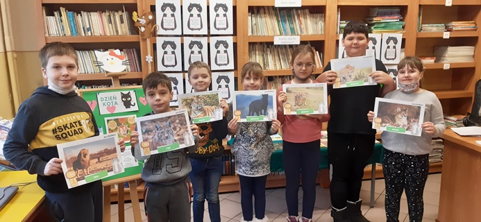17 lutego obchodziliśmy w szkole Dzień Kota. Nasza biblioteka zamieniła się tego dnia w kocie centrum, w którym można było dowiedzieć się nie tylko o zwyczajach tych milusińskich zwierzaków, ale również samodzielnie wykonać kota z papierowego talerzyka, pacynkę lub maskę. Uczniowie obejrzeli także piękne zdjęcia dzikich kotów. W oddziale przedszkolnym Pani Magda przygotowała dla swoich dzieci różne zadania związane z tym świętem. Dla aktywnych dzieci czekały jak zawsze drobne upominki.