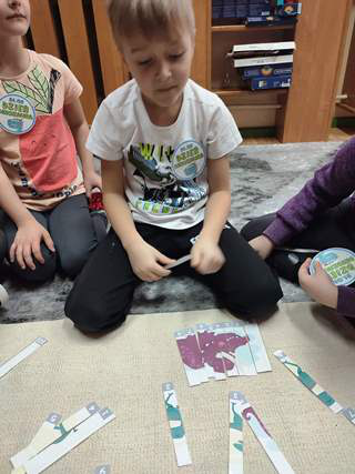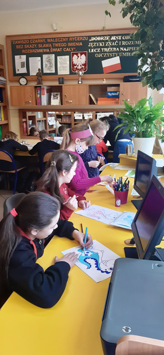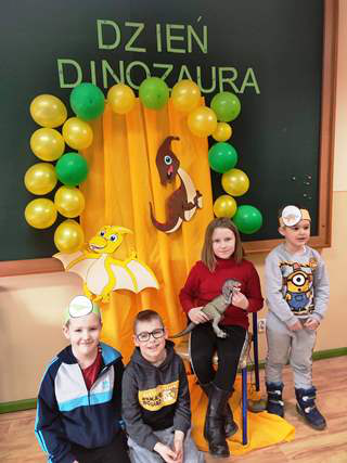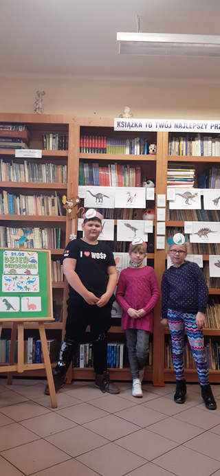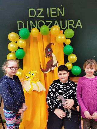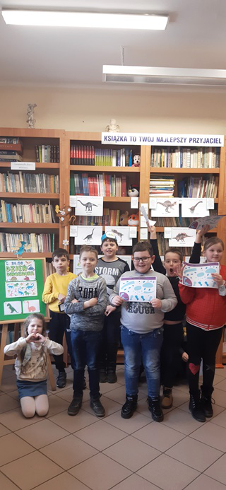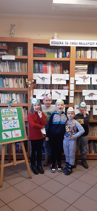 W bibliotece również tego dnia było ciekawie i miło. Dzieci wysłuchały wiersza o dinozaurach oraz dowiedziały się nie tylko jak wyglądały, ale również czym się żywiły te ogromne stworzenia. Uczniowie mieli możliwość wykonać opaskę lub pokolorować swojego ulubionego dinozaura. Na koniec chętne dzieci mogły sobie zrobić zdjęcie na ściance dinozaurów, którą przygotowała Pani Asia. To był ciekawy dzień.