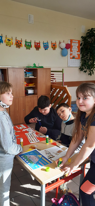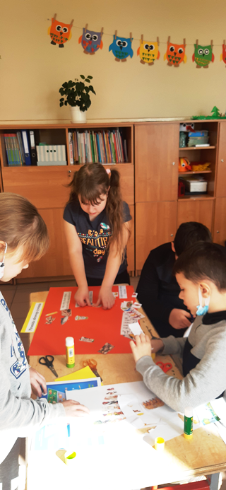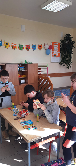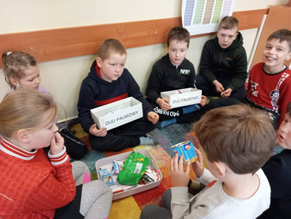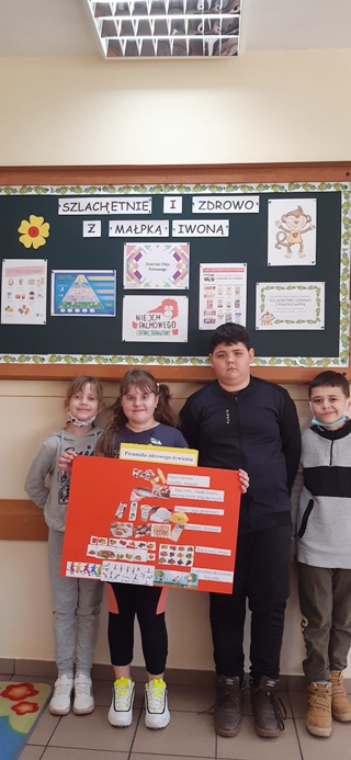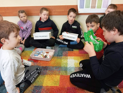 Klasy I-III w ramach projektu „Szlachetnie i zdrowo z małpką Iwoną” obchodziły Dzień bez oleju palmowego. Na początku dzieci wysłuchały wierszyka i dowiedziały się od małpki Iwony, że ważne jest czytanie etykiet. Wśród przyniesionych słodkości wyszukały również produkty, które zawierają w swoim składzie olej palmowy. Dowiedziały się, że niestety jest on obecny w ich ulubionych przekąskach i negatywnie wpływa na nasze zdrowie. Stanowi źródło tłuszczów nasyconych i podnosi poziom „złego cholesterolu” we krwi, co może prowadzić do wielu chorób. Na koniec uczniowie wykonali piramidę zdrowego żywienia i wspólnie wyciągnęliśmy wnioski z przeprowadzonych zajęć.