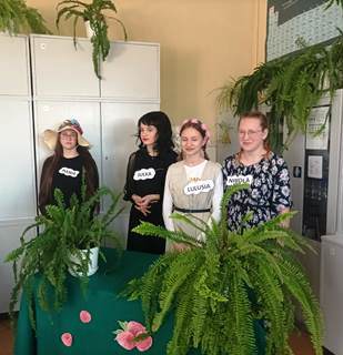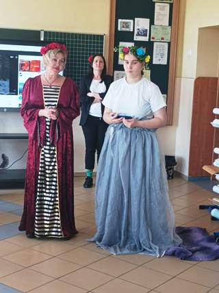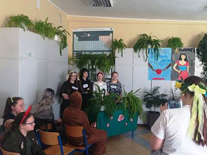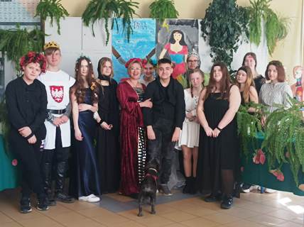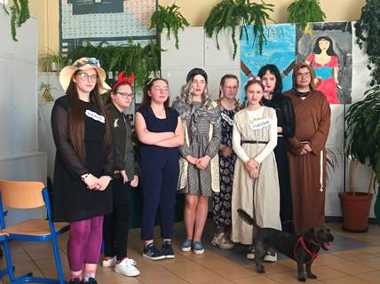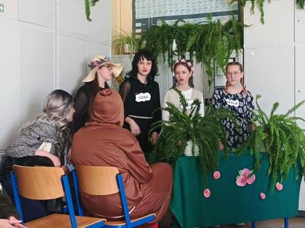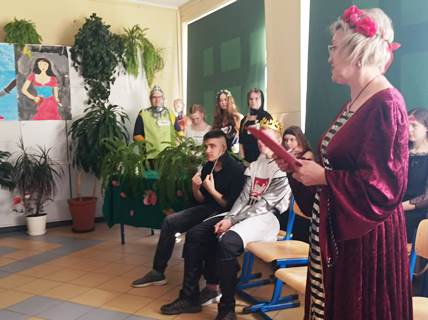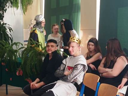 "Matko w lesie są maliny, niechaj idą w las dziewczyny" - to hasło konkursu pomiędzy klasą VII a VIII o tragedii Juliusza Słowackiego "Balladyna". Celem konkursu było utrwalenie wiedzy o lekturze i wyzwolenie zdrowych rywalizacji klasowych. Konkurs przebiegał w zielonej, leśnej scenografii z oprawą relaksacyjnej leśnej muzyki. Uczniowie przybyli w strojach bohaterów "Balladyny". Jury w którego skład wchodziła Pani Jolanta Pastor i Pani Aneta Pawszyk skrzętnie notowało punktację. Panie dbały o dynamiczność potyczek klasowych, wprowadzały miłą, życzliwą atmosferę.