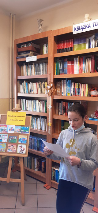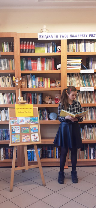 Od 22 marca chętne osoby z klas I-III uczestniczyły w porannych spotkaniach „Tydzień z wierszami Juliana Tuwima”. Codziennie na dwóch pierwszych przerwach w bibliotece starsi uczniowie czytali wiersze lubianego poety najmłodszym dzieciom. Po całym tygodniu zorganizowany został konkurs czytelniczy „Magiczne wiersze Juliana Tuwima”. Wyróżnione osoby otrzymały nagrody, a pozostali uczestnicy otrzymali dyplomy oraz drobne upominki.