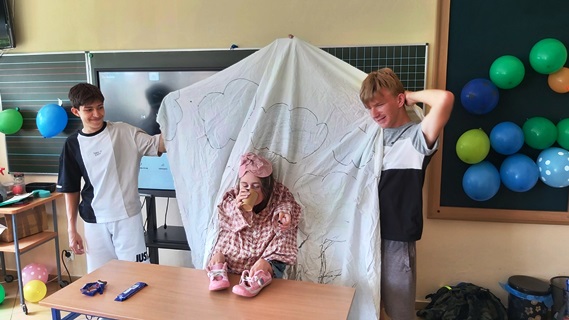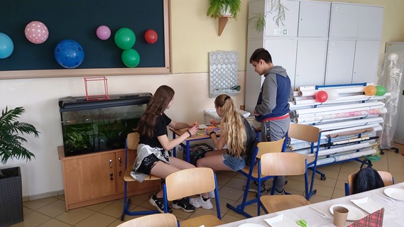 22 czerwca 2022 roku uczniowie klasy ósmej wraz z wychowawcą zajęli się przygotowaniami do uroczystego zakończenia nauki w szkole podstawowej oraz do wieczorku, który odbędzie się jutro. Odbyła się ostatnia próba występu artystycznego naszej klasy, zabraliśmy się do ustawienia stołów i ich nakrycia w naszej klasie lekcyjne, gdzie będziemy jutro spędzać wspólnie jako ósmoklasiści ostatni czas w naszej podstawówce. W między czasie Ania i Emilia pojechały do Gminnego Ośrodka Kultury, aby odebrać nagrody pieniężne wręczane przez Wójta Gminy Grunwald Adama Szczepkowskiego za wysokie wyniki w nauce. A my zajęliśmy się napełnianiem balonów, a następnie ustroiliśmy nimi cała szkołę, zaś okna na I piętrze naszego holu zakryliśmy szarym papierem, na którym narysowaliśmy różne herby rycerskie – nasza szkoła nosi imię Zawiszy Czarnego. Później ustawiliśmy stoły na świetlicy szkolne,j gdzie będą przebywać nasi goście, rodzice, nauczyciele i pracownicy naszej szkoły. W szkole pojawiła się Pani Elżbieta Pszczelok, której złożyliśmy podziękowania za współpracę. Następnie był czas na przerywnik, czyli składanie w grupach ze słomek kostek do gry i innych figur przestrzennych oraz zabawa „karmienie dziecka”. Przygotowania zakończyliśmy podczas piątej lekcji i wyszliśmy na szkolne boisko, by oczekiwać na transport do domu. Pracy było co nie miara, ale warto było. Szkoła jest przygotowana na naszą jutrzejszą imprezę…