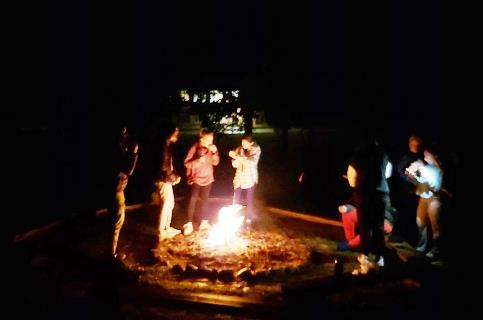 Następnie po krótkim odpoczynku udaliśmy się na ognisko z pieczeniem kiełbasek, które odbyło się po północy, zaś zostało rozpalone przez Julię i Amelię. Po powrocie był czas na toaletę wieczorną, zebranie komórek i ulokowanie ich w pokoju nauczycielskim, a następnie już w śpiworach mogliśmy zagłębić się w tajniki filmu-horroru poprowadzone przez Julię i Emila. Po strasznym filmie została ogłoszona cisza nocna i mogliśmy „spokojnie” zasnąć wsłuchując się w bicie własnego serca…, niektórzy uczestnicy nocki nawet słyszeli dziwne odgłosy dochodzące z parteru naszej szkoły, a nawet piwnic.