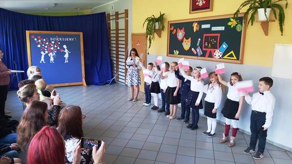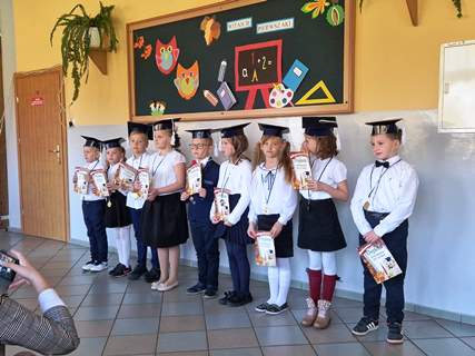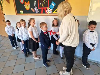 „Ślubuję być dobrym Polakiem, dbać o dobre imię swej klasy i szkoły..." - to pierwsze słowa tekstu ślubowania podopiecznych Pani Anety, którzy w miniony czwartek zostali oficjalnie przyjęci w poczet uczniów Naszej szkoły. Zanim Pierwszaki zostali magicznym ołówkiem pasowani przez Panią dyrektor Jolantę Pastor na uczniów, wcześniej musieli wykazać się umiejętnościami, które już osiągnęli. Były więc piękne recytacje, śpiewanie piosenek oraz umiejętność odpowiedzi na szereg bardzo ważnych pytań. Na zakończenie wszyscy otrzymali dyplomy, medale oraz upominki.
