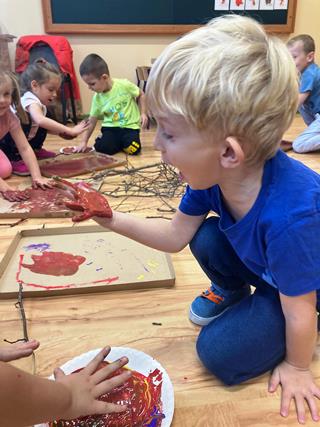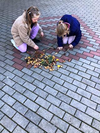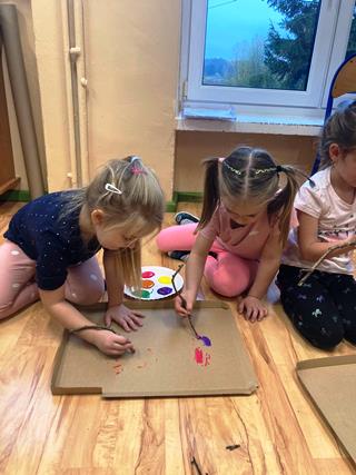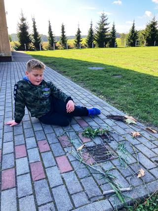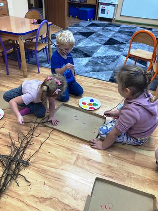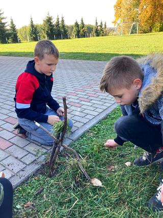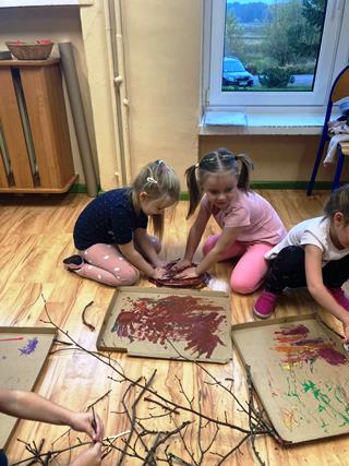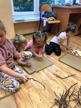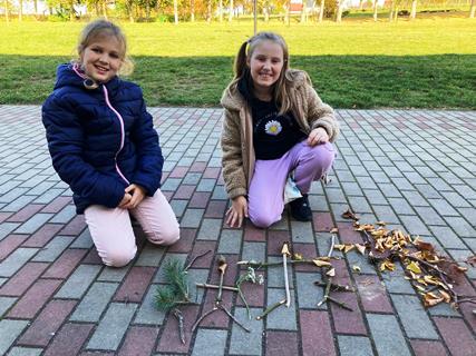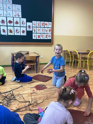 W ramach innowacji „Z darami natury świat nie jest ponury” przedszkolaki wykonały zadanie „Patykiem pisane”. Zajęcia poprzedzone były Wielką Lekcją – historia pisma. Dzieci z oddziału przedszkolnego zamieniły się w ludzi pierwotnych i za pomocą patyków tworzyły swoje piktogramy. Zabawa skończyła się wielkim bałaganem, co sprawiło im wiele radości.