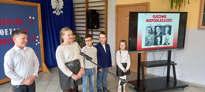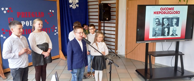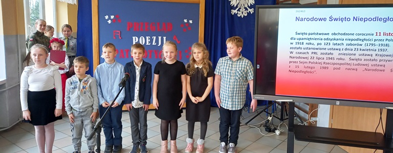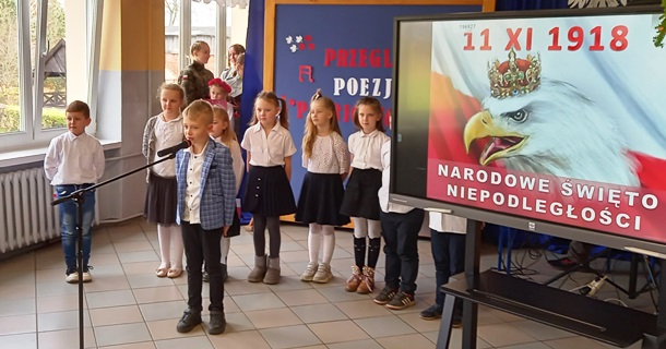 W bieżącym roku szkolnym postanowiliśmy zapoczątkować nową tradycję w naszej szkole i rozszerzyć obchody Narodowego Święta Niepodległości na trzy dni: 9 listopada zaplanowany został Przegląd Poezji Patriotycznej, 10 listopada udział w ogólnopolskiej akcji śpiewania hymnu Polski o godzinie 11.11, 11 listopada, ponieważ to dzień wolny od zajęć, zachęcenie do udziału w uroczystościach organizowanych przez lokalne władze. Rozpoczęliśmy obchody najważniejszego święta państwowego od Przeglądu Polskiej Poezji Patriotycznej. W przeglądzie wzięły udział wszystkie klasy 0-8, które zaprezentowały wiersze oraz pieśni patriotyczne. Głównym celami uroczystości były: