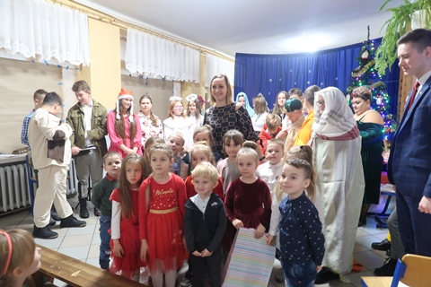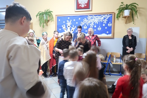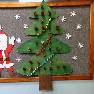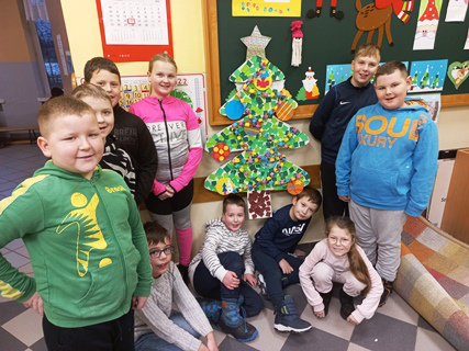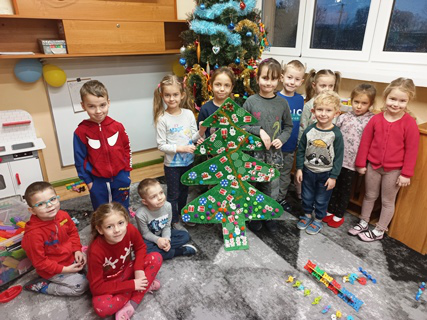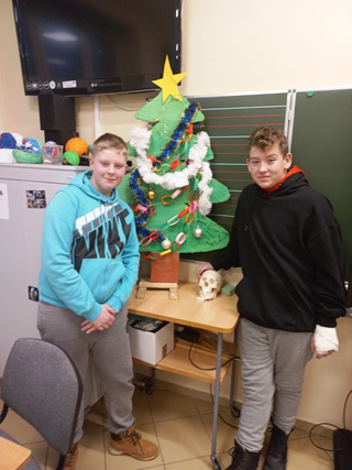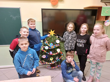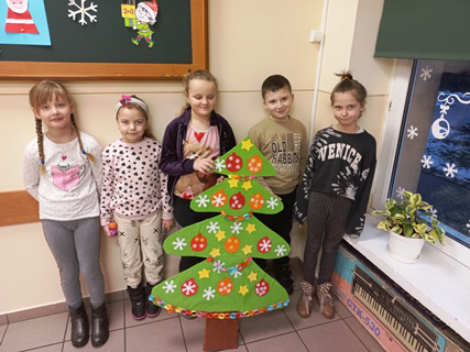 Zadaniem każdej z klas było ozdobienie tekturowej choinki. Uczniowie wykazali się kreatywnością, talentem, a także pomysłowością. Choinki były ozdabiane kokardkami, gałązkami świerku, bibułą, naklejkami, szyszkami, a nawet cukierkami i żelkami. Każda była piękna i niepowtarzalna.