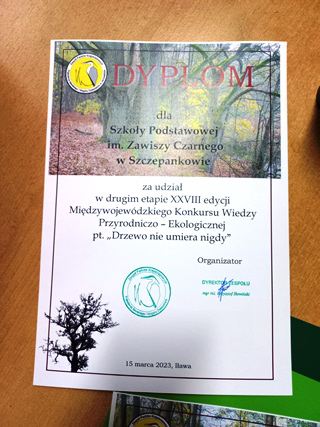 W dniu dzisiejszym (15.03.) uczniowie z klasy czwartej: Adrian Kołakowski, Julia Golian, Alicja Ślesińska i Amelia Klimkiewicz-Osińska wzięli udział w drugim etapie konkursu wiedzy przyrodniczo-ekologicznej pod hasłem "Drzewo nie umiera nigdy" organizowanym przez Zespół Parków Krajobrazowych Pojezierza Iławskiego i Wzgórz Dylewskich. Konkurs odbył się w Iławie i wzięły w nim udział 32 szkoły z województwa warmińsko-mazurskiego. Dzieci rozwiązywały test, który miał formę pytań zamkniętych. Każdy uczestnik miał 45 minut na wykonanie 25 zadań. Uczniowie mogli konsultować odpowiedzi w swojej grupie, jednak każdy miał swoją kartę odpowiedzi.