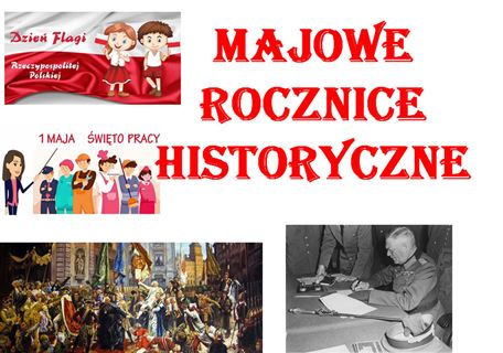 Na czoło ważnych wydarzeń wysuwa się kolejna, 232., rocznica uchwalenia Konstytucji Majowej z 1791 roku. Dla historii Polski ważne także są kolejne wydarzenia: Święto Flagi, rocznica wydania Uniwersału połanieckiego z 07 maja 1794 roku, 18 maja 1944 rok – rocznica zdobycia Monte Cassino przez II Korpus Polski, 18 maja 1920 rok – rocznica urodzin Karola Wojtyły, późniejszego papieża, Jana Pawła II. Nie można zapomnieć i o innych wydarzeniach, które odbyły się w przeszłości w maju, ale mogą być kontrowersyjne - jak zamach majowy z 1926 roku czy klęska oddziałów powstańczych pod Ostrołęką z 1831 roku. Na koniec nie można zapomnieć o międzynarodowym święcie czyli Święcie Pracy, które w naszej historii wciąż kojarzone jest jeszcze (chociaż korzenie tego święta znajdują się w USA) ze starym, komunistycznym system PRL.
