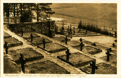 z których siedem zajmują żołnierskie mogiły, a jeden pełni funkcję komunikacyjną. Zbocza tarasów oraz skarpy okalające cmentarz i przyległy od strony południowej plac apelowy wzmocnione kamieniami polnymi. W narożniku południowo-wschodnim pseudobastion wzniesiony z kamiennych ciosów. Na koronie muru wysoki, drewniany krzyż. Na każdym grobie ustawiony drewniany krzyż. Mogiły otoczone krawężnikami z kamieni polnych. Granice cmentarza obsadzone były szpalerem świerkowym, zachowanym obecnie w stanie szczątkowym. Teren samego cmentarza obsadzony sosnami. Obecny stan cmentarza wygląda na dobry, odrestaurowany w 1993 r. W 2005 r. krzyż na koronie muru został zastąpiony nowym.