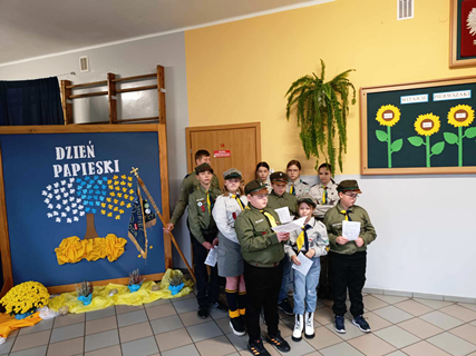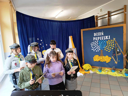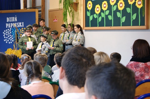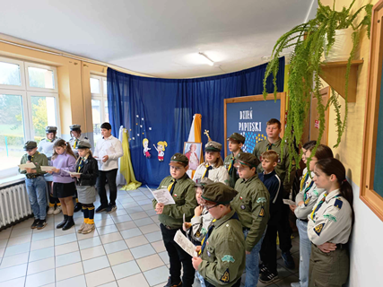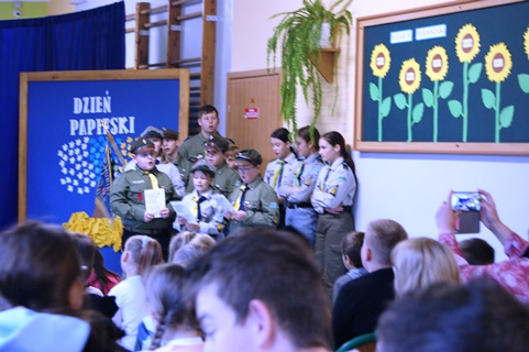 19 października 2023 roku odbył się apel z okazji XXIII DNIA PAPIESKIEGO, który przygotowała Pani Grażyna Napiórkowska. Wystrój sceny przygotowała Pani Joanna. Nasi uczniowie, w dużej większości harcerki i harcerze oraz biszkopty z 3 Grunwaldzkiej Drużyny Harcerskiej „Ogniki” im. Karola Wojtyły, zaprezentowali wybrane teksty dotyczące życia Jana Pawła II – Karola Wojtyły oraz pieśni religijne przy akompaniamencie drużynowego Wilka na gitarze… Wszyscy z powierzonego zadania wywiązali się wzorcowo o czym świadczą podziękowania od Pani dyrektor Jolanty Pastor i Pani Grażyny Napiórkowskiej, która uraczyła nas 3 GDH słodkościami - dziękujemy. Po apelu wszyscy rozeszli się do swoich sal lekcyjnych na zajęcia lekcyjne.