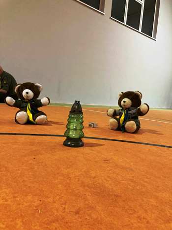 a to oznacza, że wszystkie jednostki naszego Związku Drużyn Ostróda liczyły ponad 80-ciu uczestników. Po apelu zaczęły się zabawy rekreacyjno-sportowe „W zdrowym ciele, zdrowy duch”: rynienka z piłeczką, pająk z kubeczkiem, zbieranie szarf za pomocą chwytaka, rzuty do kosza, wrzucanie piłek do pojemnika na jajka. Zabawy było co niemiara. Później wszyscy otrzymali bawełniany worek, aby zrealizować zadanie „Z plecakiem przez świat” do przyozdobienia kolorowymi rysunkami i napisami. Worki po zakończeniu rysowanek wyglądały przepięknie. Po kolacji odbyło się świeczkowisko „Poznajmy się”, podczas którego każda drużyna zaprezentowała informację o sobie, trzy piosenki i jeden pląs. Na świeczkowisku były też dwie maskotki naszej drużyny. Po toalecie wieczornej, zmęczeni zmaganiami, wszyscy udali się na spoczynek, by już jutro wyruszyć na rajd pieszy po okolicy.