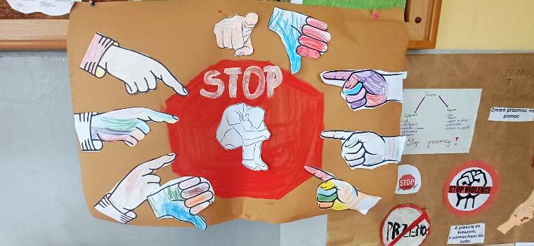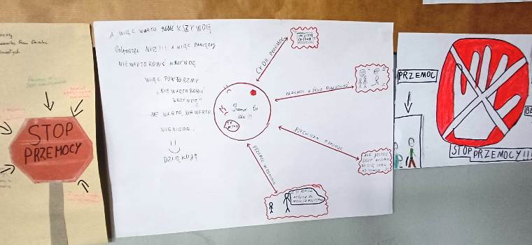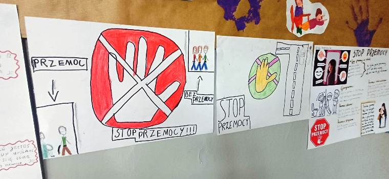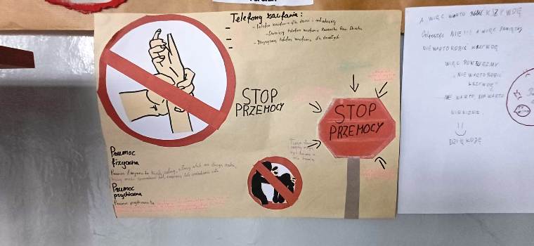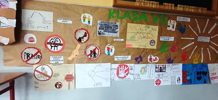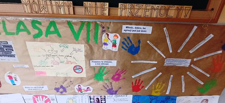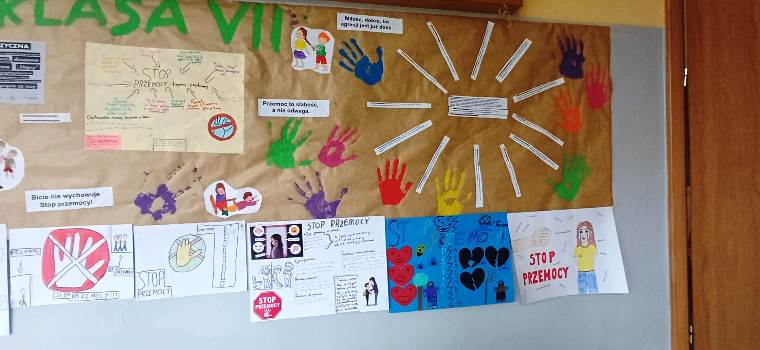 Zakończyliśmy w naszej szkole program pod hasłem "Tydzień bez przemocy". Podczas jego trwania wychowawcy prowadzili w swoich klasach zajęcia na temat przemocy, na korytarzu postawiona była skrzynka, do której uczniowie mogli wrzucać swoje odpowiedzi, uwagi, spostrzeżenia związane z tematem. Finałem programu było rozstrzygnięcie konkursu na plakat pt. STOP PRZEMOCY! Wyróżnione zostały 2 prace grupowe - klasa VII i grupa Sówki.